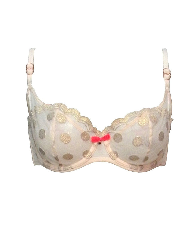 Pop the cork on this number worthy of a celebration! Oversized dots shimmer with glints of gold on a beige background complete with a touch of neon orange and luxurious gold hardware. This lined underwire bra features demi cups and adjustable back straps. The pièce de résistance includes a pleated bow with opal-like charm in front and embroidered back bows as an extra surprise. Wear it with the Champagne Thong for the celebration of a lifetime.