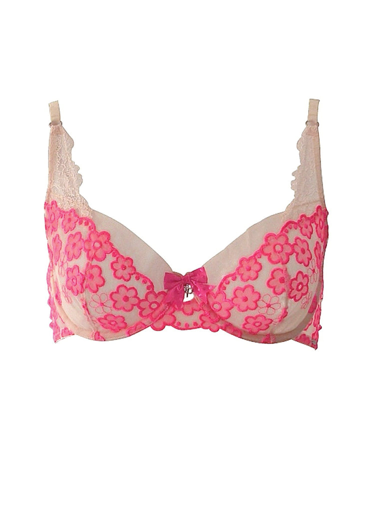 You'll be in a daisy daze with this daisy demi bra featuring beige mesh and neon hot orange embroidery. The pop of color will shock while the lace trim and sweet accents really up the ante. This lined underwire bra has adjustable back straps with dotted bows accenting the front and back complete with logo charm and embroideries. Wear it with the Daisy Tanga if you really want to make an impression.