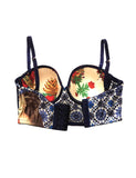 Florals for everyone! This whimsical bustier boasts molded, padded cups, wire boning and an abundance of charm. The mosaic floral printed bodice surprises with folkloric embroidery on the front and a cheeky monkey printed on the side. A contrast tattoo-inspired print on the inside of the cups adds another intriguing detail along with adjustable and removable straps, gold hardware and feminine scalloped elastic. Pair it with the Martina Hipster for a pretty picture.
