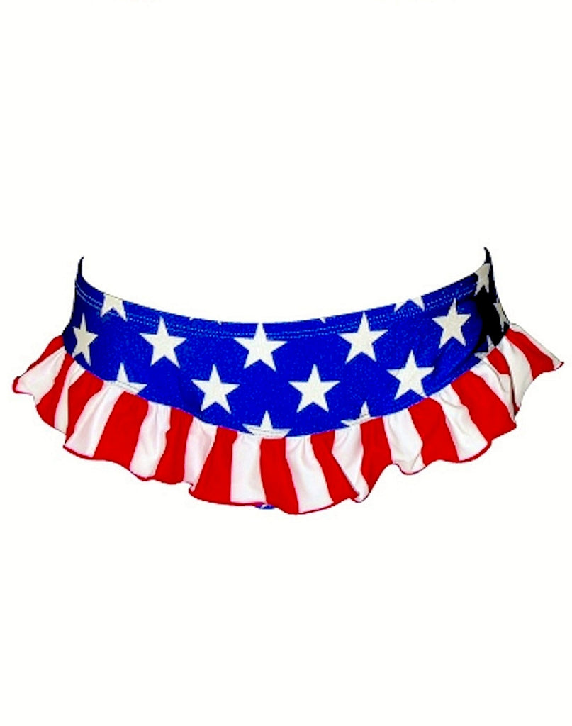 Does your heart beat true for the red, white and blue? It will for this star spangled hipster with skirted striped ruffle around the bottom. Fully lined with slight rushing in the back, you'll feel like a patriotic princess in this little number. Wear it with the Grace Swim Top for the maximum effect.