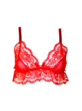 As delicate as a fawn and just as sweet, this lace triangle bra is a romantic addition to any wardrobe. Soft mesh cups are lined with wide floral lace and a flirty ruffled waistband topping off the look. The straps are adjustable in back along with a hidden back closure while a matching satin bow with silver heart charm accents the front neckline. Wear it with the Fawn Garter Belt and Fawn Thong for a darling look.