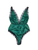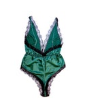 Make them green with envy - emerald green! Satin has never looked so sexy in this retro one piece complete with black lace trim and a cinched elastic waist. The plunging neckline will have them staring while the high cut legs will tease as to what's hidden beneath. Top it off with gold hardware and a fierce attitude & nothing will stop you now. Available up to a size 3X.