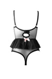 Sass, class and a great a$$... that's what it takes to rock this gorgeous teddy. Stretch mesh fits like a dream with triangle cups and feminine seaming to accentuate in all the right places. The 4 inch peplum girlishly accents the waist with a pretty pink ribbed bow in the back. Scalloped elastic, adjustable straps and a hook & eye closure make this unlined suit swanky and sensual at the same time.