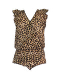 Grrrr baby.... this look is fierce! A mesh teddy with wrap front and skirted bottom is just what the doctor ordered. This leopard print teddy is cat-tastic! Ruffled sleeves and scalloped mesh elastic add the perfect finishing touches while the neckline is tacked closed for (some) modesty. The elastic waistband and hidden full coverage briefs below make this one-piece a wild addition to your boudoir collection.