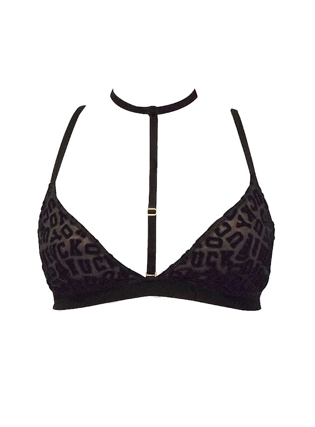 F-yeah! The FU triangle bralette is right up our alley with its edgy, removable harness and explicit declaration. Dainty mesh gets a makeover when velvet F's, U's, C's and K's are scattered on it, guaranteeing your message will be heard loud and clear. The adjustable choker can be removed to change up the look and the wide waistband ensures support where you need it the most. Wear it with the FU Hi Waist Briefs and really give them a piece of your mind.