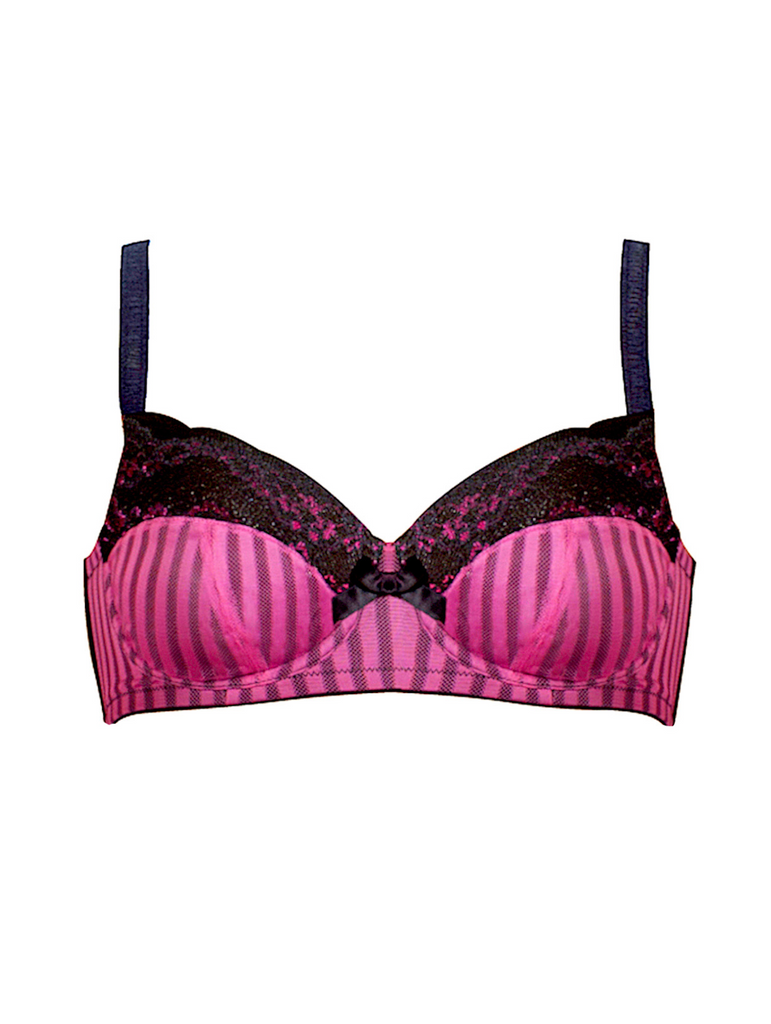 Earn your stripes in this retro style underwire bra with lace trim, satin bow and ruched straps. This seamed, soft cup bra will bring out your glam side mixing girly pink and sultry black for a look evoking the old Starlets of Hollywood past. Plus the power mesh wings and sturdy trims ensure this is one bra that won't slip, pinch or pull. Wear it with the Pinstripe Thong for the last word in glamour.