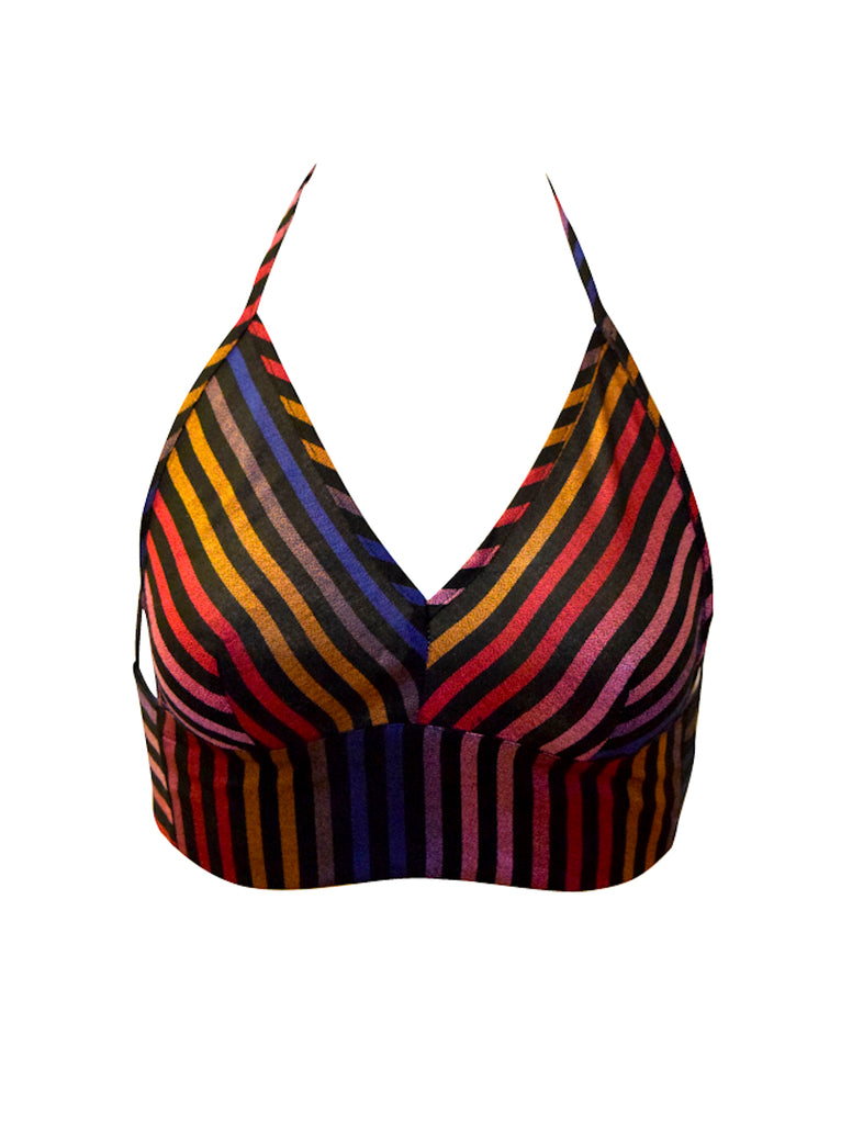 If you missed the rainbow connection before, you're sure to catch it here. This super soft triangle bralette has an adjustable halter neckline and a wide sash in back for a retro look, while the rainbow stripes bring this top into modern day. A wide waistband and side elastics help secure this comfortable yet playful bra. Wear it with the Riley Short for a colorful take on pin up fashion.