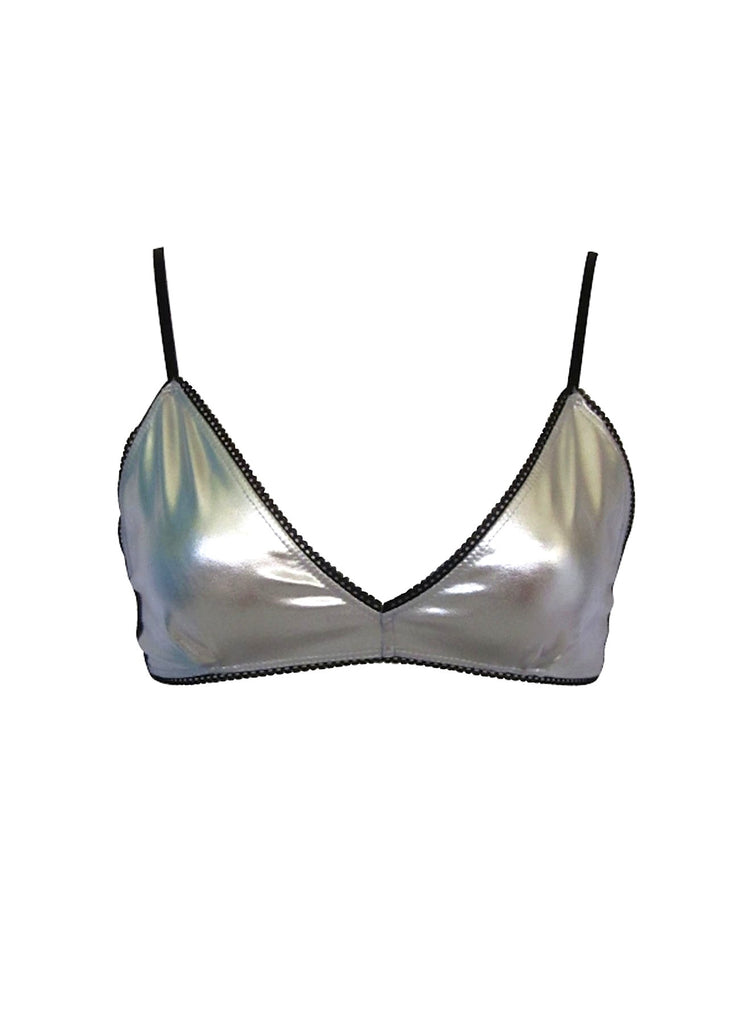 This bralette gets an A+ in our silver linings playbook! This foil metallic number is fabulous and flashy with sheer black mesh in the back for breathability. Adjustable straps and picot trim add the finishing details on this dimepiece, perfect for lounging around or showing it off. Wear it with the Sterling thong and shine on.