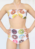 Sprinkled, glazed, iced or powdered, sweet donut treats like these are bound to get noticed. This retro bikini top is complete with front keyhole and braided halter ties that can be worn a variety of different ways. Fully lined with back ties, you'll be tempted to indulge in this mouth-watering number that's both cute and calorie-free. Wear it with the Donut Swim Bottom to really satisfy your sweet tooth.