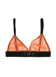 Don't let the sun go down on this sunset orange number. This bright lace triangle bra pops alongside the contrasting black elastic details and tailored satin bow. Soft lace sits against the skin with decorative adjustable straps and a sturdy waistband for some support. Wear it with the matching Maike Knickers for a sunny look.