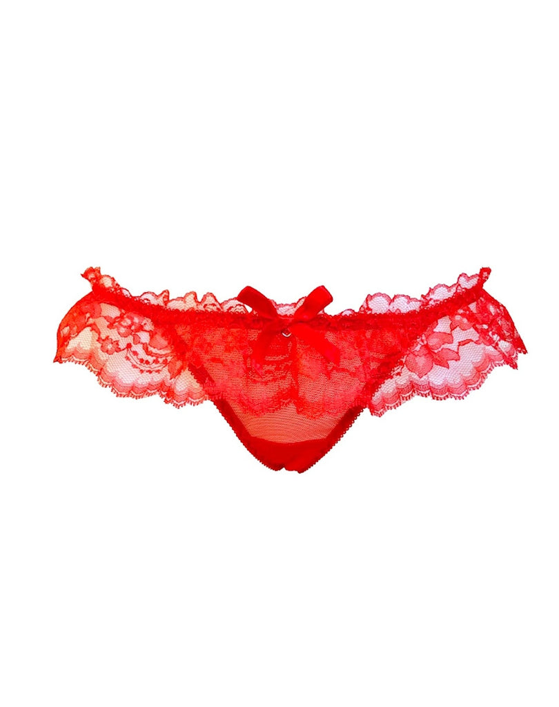As delicate as a fawn and just as sweet, this ruffled thong is a romantic addition to any wardrobe. Soft mesh is topped with a wide floral lace ruffle for a flirty look while the matching satin bow with silver heart charm accents the front. Wear it with the Fawn Bra and Fawn Garter Belt for a darling look.