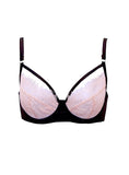 Pump up the volume in this edgy underwire bra that's part sexy, part sweet. Pastel peach lace makes for a soft, pretty cup accented with black satin straps at the décolletage. A mesh back adds extra comfort and stretch with gold accents for a bit of smoking hot glamour. Wear it with the Tamara Brief for ultimate smoldering. Available up to a size 40G.